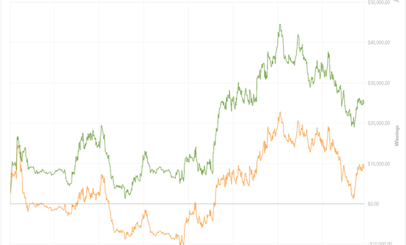 Njegov graf prikazuje približno 25.000 $ dobička na mesec in ne smemo pozabiti še na približno 20.000 $ v rakebacku.