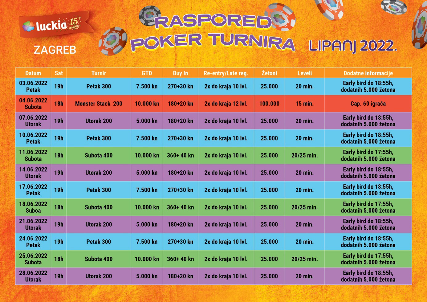 In če slučajno med počitnicami bivate v Zagrebu in si želite pokra v živo, lahko najdete dobro turnirsko akcijo v Luckia Poker Roomu, kjer potekajo turnirji 3x na teden: ob torkih, petkih in sobotah.