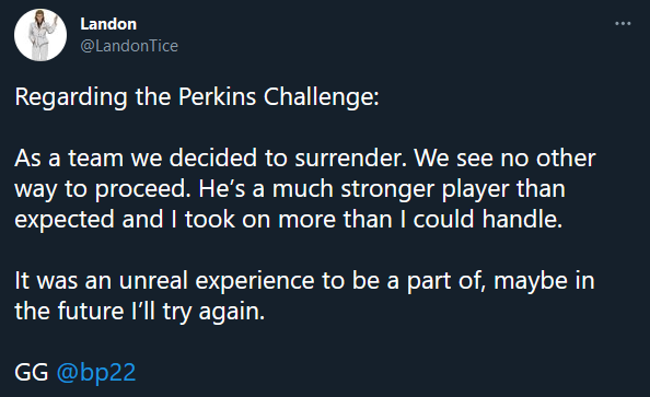 S predajo Tice ni dolžan Perkinsu izplačati celotnih 720.000 $. Namesto tega, kot je zapisal na Twitterju, dolguje povračilo v višini devetih big blindov na 100 odigranih iger (176.652 $), skupaj s stransko stavo v višini 200.000 $ to znaša okoli 312.932 $. Perkins je izplačal svoje poker coache po dogovoru z Landonom.