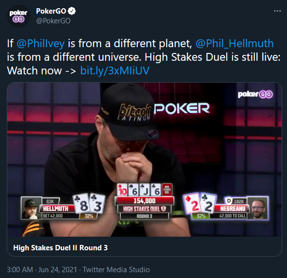 “Mislim, da si eden najboljših igralcev vseh časov,” je odgovoril Hellmuth. “Resnično to mislim.”