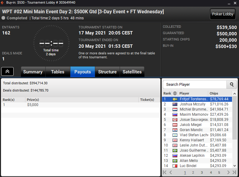 Fritjof Torstensson se lahko predstavi kot prvak WPTja, ker je bil Šved zadnji mož na WPT #02 Mini Main Eventu, rezultat pa mu je prinesel lepih 78.769 $. Neverjetno je to dejstvo, da je Torstensson svoj sedež na tem turnirju osvojil s satelitom v višini 5,50 $.
