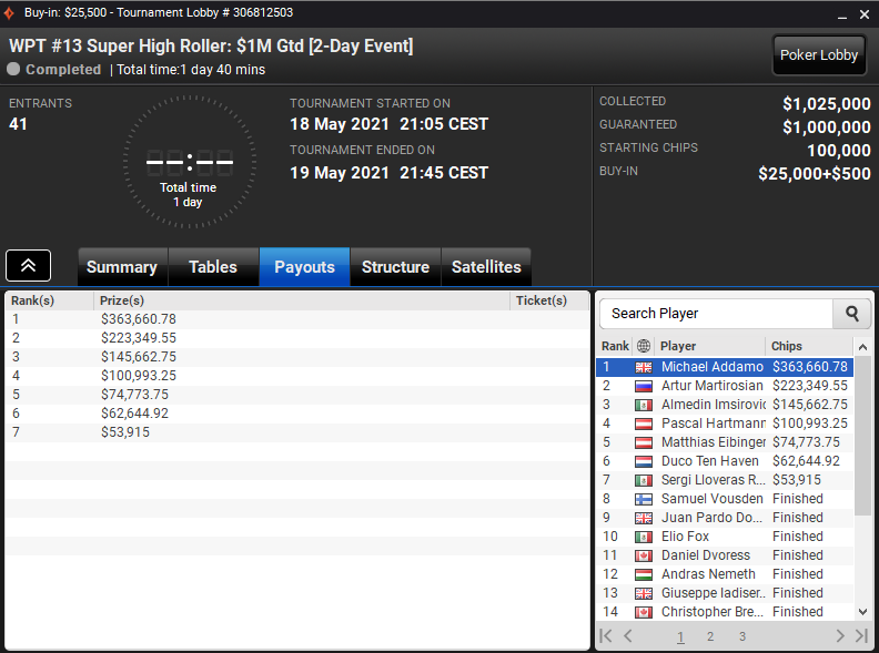 Michael Addamo kaže neverjetne predstave na letošnji izdaji WPT Online Series na partypokru. V začetku tega tedna je osvojil WPT High Roller Turbo za 87.459 $ in končal na tretjem mestu na 10.300 $WPT #05 High Roller (116.183 $), zdaj pa je dodal še dodatnih 363.661 $, potem ko je na turnirju #13: 25.500 $ Super High Roller premagal Arturja Martirosiana.