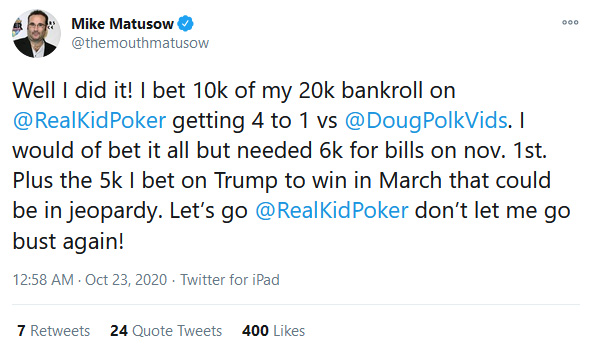 Mike “The Mouth” Matusow je četrtek twitnil, da je stavil kar