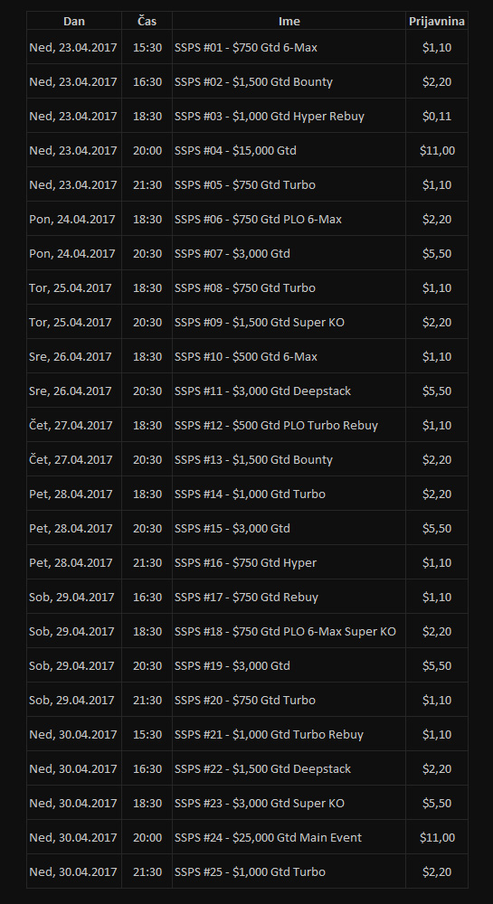 Od 23. do 30. aprila se bo zvrstilo 25 različnih eventov, kjer bodo prijavnine znašale od 0,11 $ do 11 $, tako da bo serija resnično dostopna prav za vsakogar. Poleg vsega še ponujajo 100% do $50 bonusa s kodo SSPS2017. Tisti, ki se boste udeležili večine turnirjev, pa se boste lahko tudi borili za najvišja mesta v skupni razvrstitvi serije. Nagrajenih bo kar 500 najboljših igralcev, prvi na lestvici pa bo prejel turnirske vstopnice v višini več kot 1200 $!