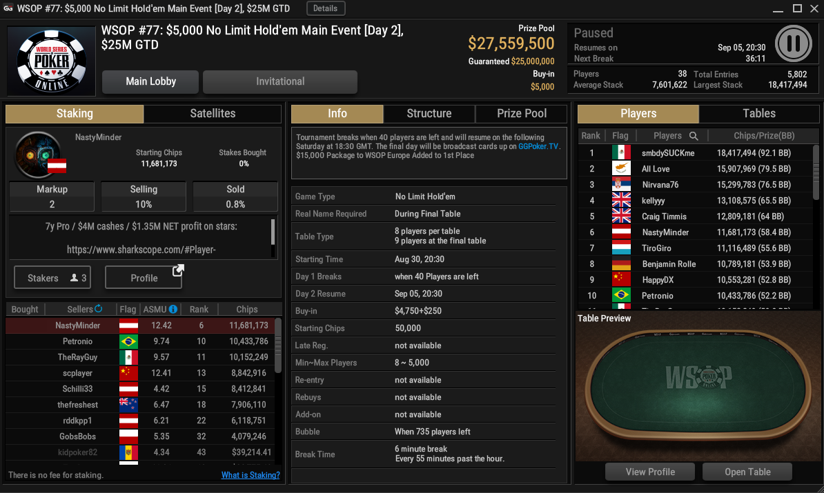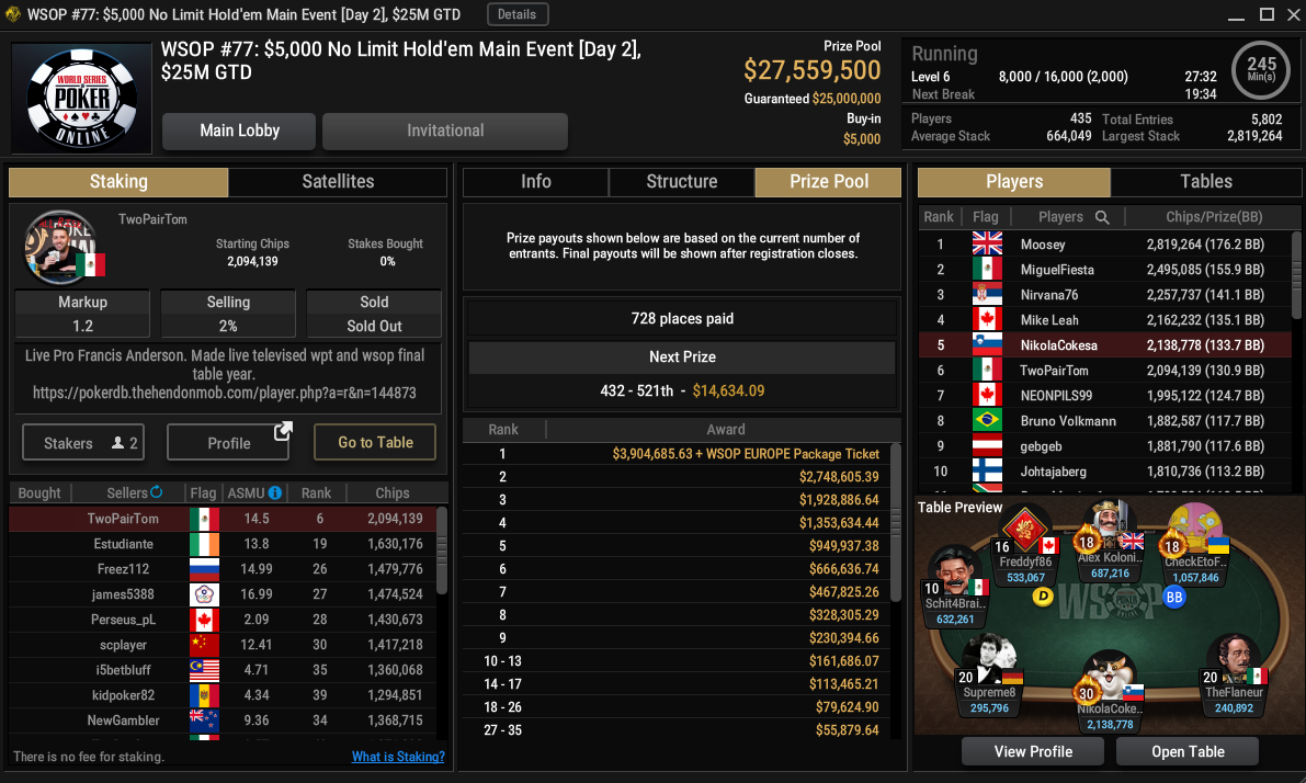 Trenutno najbolje kaže Američanu Bryanu “smbdySUCKme” Piccioliju, ki si je priigral 18.417.494 žetonov. Trenutno na osmem mestu pa je eden najbolj znanih online igralcev Benjamin “BencB” Rolle.