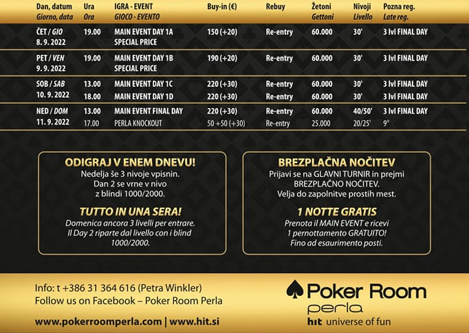 Festival bo potekal od 8. do 11. septembra, pričakuje pa se kar 100.000 € v nagradnem skladu. Na sporedu bosta dva turnirja, vse oči bodo pa seveda uprte v Main Event, ki bo imel z dnevoma 1A in 1B tudi manjšo prijavnino v višini 150+20 € v četrtek oziroma 190+20 € v petek. Nato v soboto sledita še dan 1C in 1D z 220+30 € prijavnine, glavni turnir pa se zaključi v nedeljo s finalnim dnem.