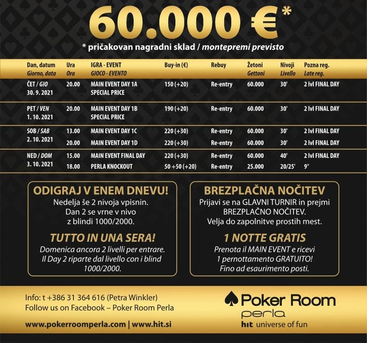 Festival bo potekal od 30. septembra do 3. oktobra, pričakuje pa se 60.000 € v nagradnem skladu. Na sporedu bosta dva turnirja, vse oči bodo pa seveda uprte v Main Event, ki bo imel z dnevoma 1A in 1B tudi manjšo prijavnino v višini 150+20 € v četrtek oziroma 190+20 € v petek. Nato v soboto sledita še dan 1C in 1D z 220+30 € prijavnine, glavni turnir pa se zaključi v nedeljo s finalnim dnem.