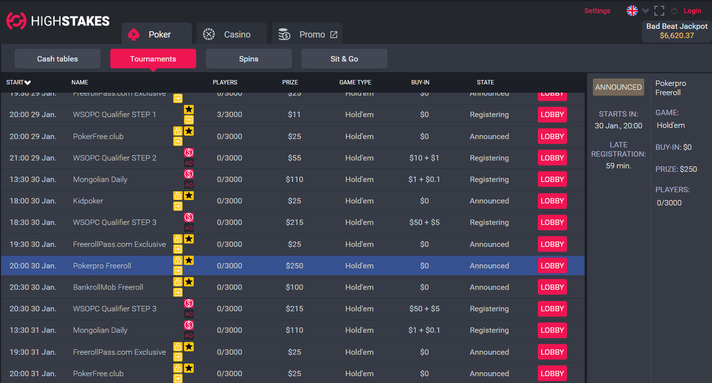 Odprite račun na HighStakes Poker preko nas in si zagotovite vstop na PokerPro 250 $ freeroll turnir, zraven pa dobite še BREZPLAČNIH 5 $ bankrolla in še precej drugih ugodnosti. Prvi freeroll turnir se bo odvil to nedeljo, 30.1.2022 ob 20.00!