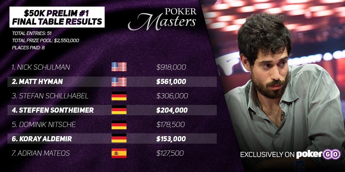 Naj omenimo še, da je Daniel Negreanu, ki je s številnimi ostalimi igralci sklenil milijonsko stavo, da bo ravno on na koncu zmagovalec celotnega Mastersa, končal prvi turnir na 8. mestu, v drugem pa se mu ni uspelo uvrstiti v denarne nagrade. Istočasno s finalno mizo in heads-up borbo je namreč že potekal tudi drugi dan Mastersa. Matt Hyman je takoj po porazu v finalu tudi opravil pozno registracijo na drugi turnir, med tem ko se Nick Schulman za to opcijo ni odločil, kar je nekoliko presenetljivo, glede na to, da bo na koncu vijolični suknjič prejel igralec z največjimi denarnimi nagradami, zato prav vsak nastop šteje. Je pa v tem trenutku jasno, da sta edina, ki bi mu lahko odvzela trenutno vodstvo, Španec Adrian Mateos in Nemec Steffen Sontheimer, saj sta edina, ki sta se tudi tokrat uvrstila na finalno mizo.