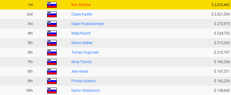 Gostiša je z zmago na HendonMob lestvici prehitel Caseya Kastla in s tem tudi prevzel vodstvo z 2,032,462 $ zaslužka na turnirjih v živo.