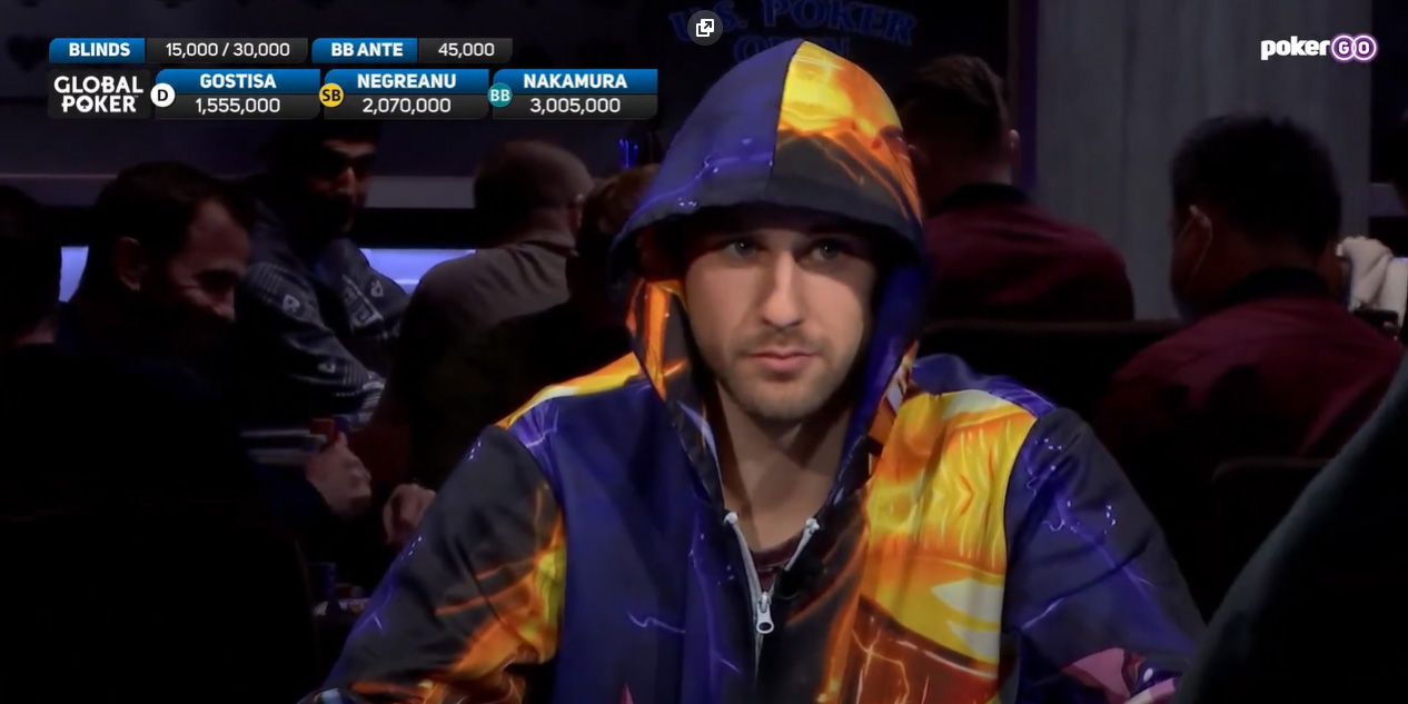 Heads-up igra se je začela tako, da je imel Nakamura 4,290,000 žetonov ob Gostišinih 2,340,000, zadnji hand pa je bil kmalu odigran v NL hold’emu.