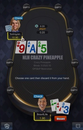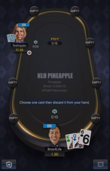 V Pineappleu odvržete karto takoj, ko so razdeljene karte. Čas za sprejem odločitve je omejen (time bank ni mogoče uporabiti med tem časom). Če se preprosto ne morete odločiti, bo aplikacija naključno zavrgla eno od treh kart, ko bo čas potekel. Zavržena karta se nato prikaže sivo ob vaši roki kot opomnik.