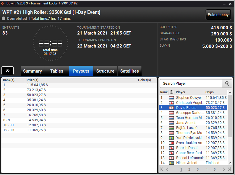 O’Dwyer in Christoph Vogelsang, velikana turnirskega poker sveta, sta bila zadnja dva živa, O’Dwyer pa je na koncu prevladal in svoj buyin v višini 5.200 $ spremenil v 115.641 $. Vogelsang bo razočaran, ker je bil tako blizu naslovu, toda 73.213 $ je še vedno izjemen dosežek.