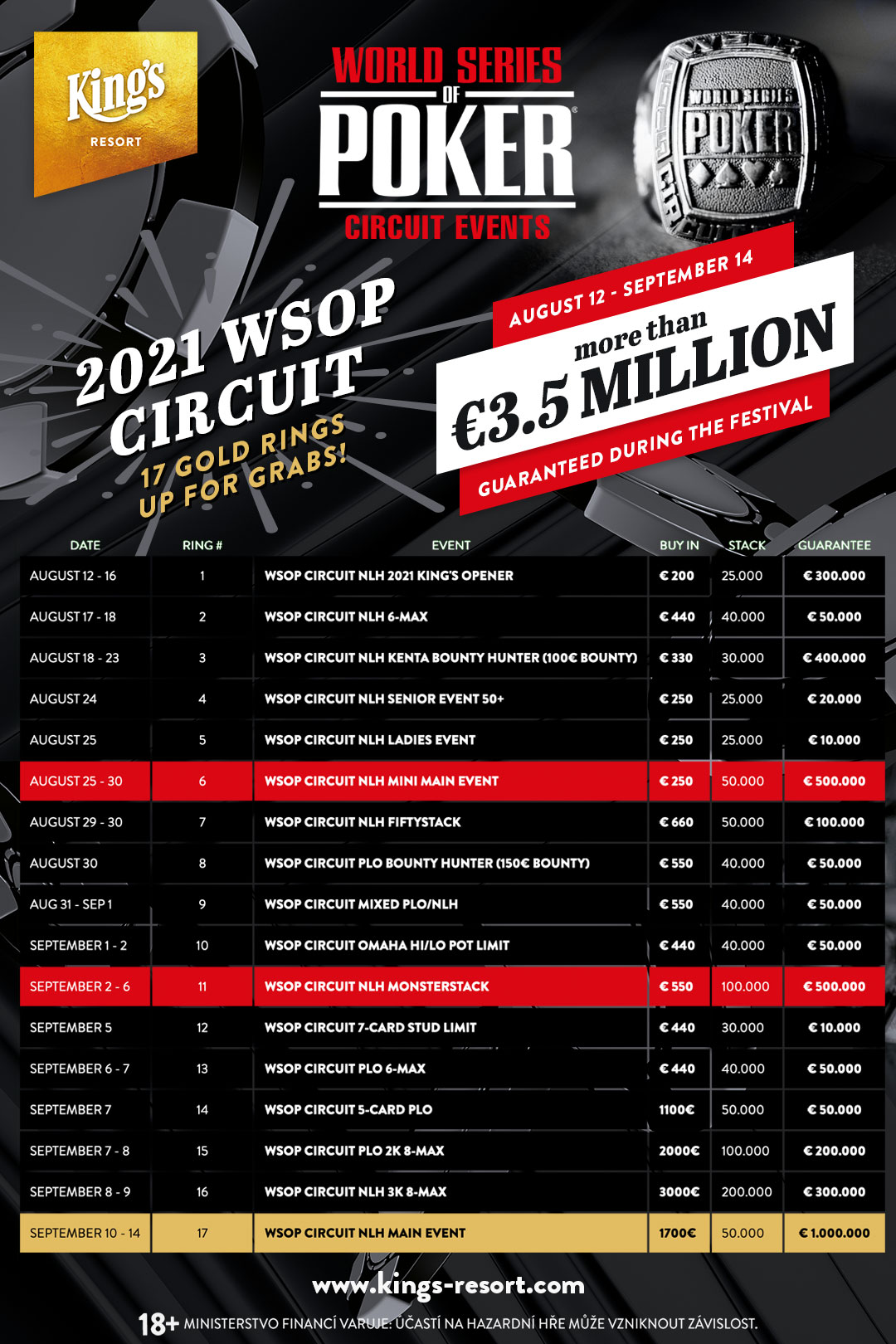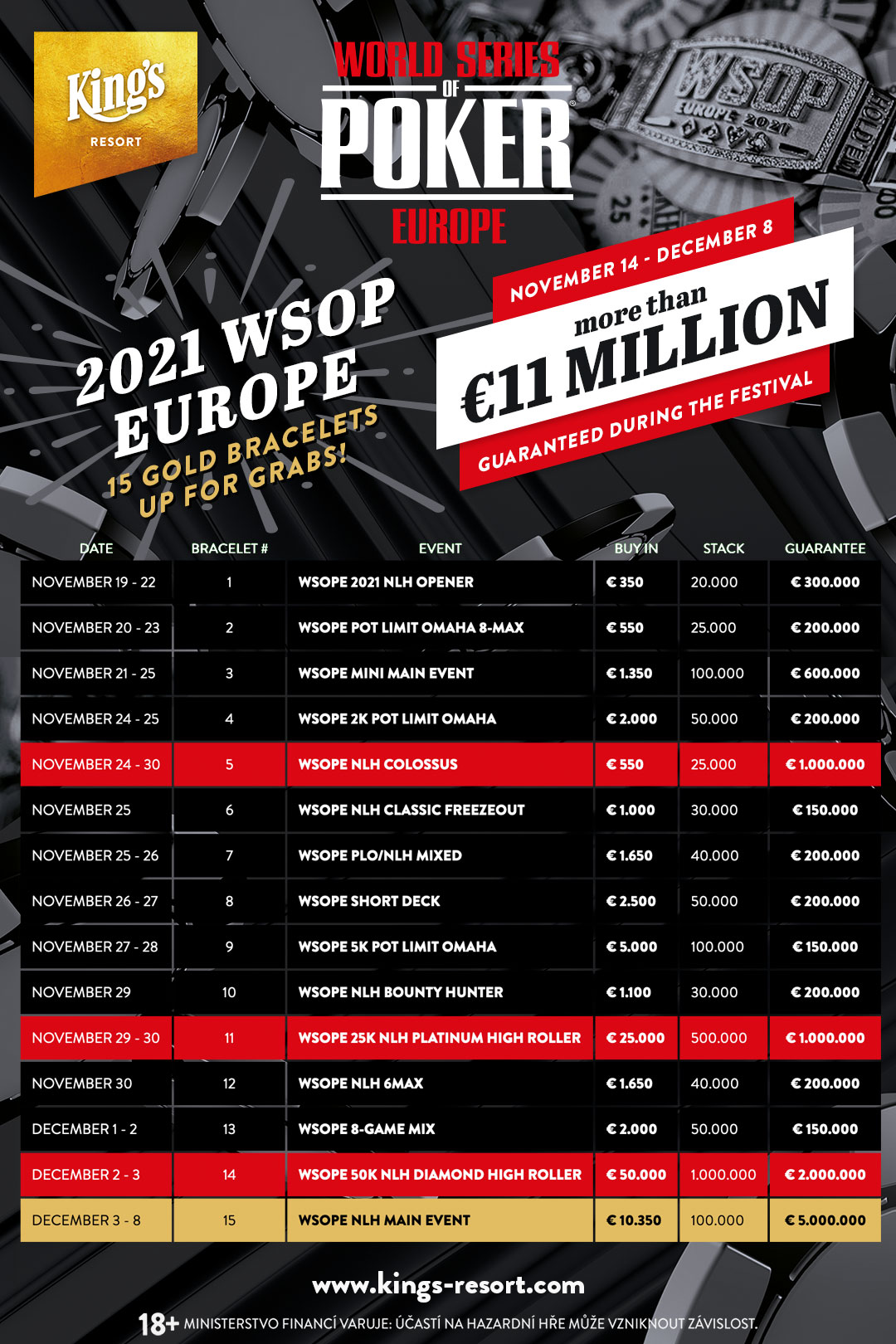 V ponedeljek, 12. julija, je World Series of Poker uradno objavil spored za 2021 WSOP Europe, ki naj bi potekal od 19. novembra do 8. decembra letos. WSOPE bo znova potekal v letovišču King’s Resort v Rozvadovu na Češkem. Letos bo serija vključevala 15 zlatih zapestnic z več kot 11 milijoni evrov garantiranih denarnih nagrad.