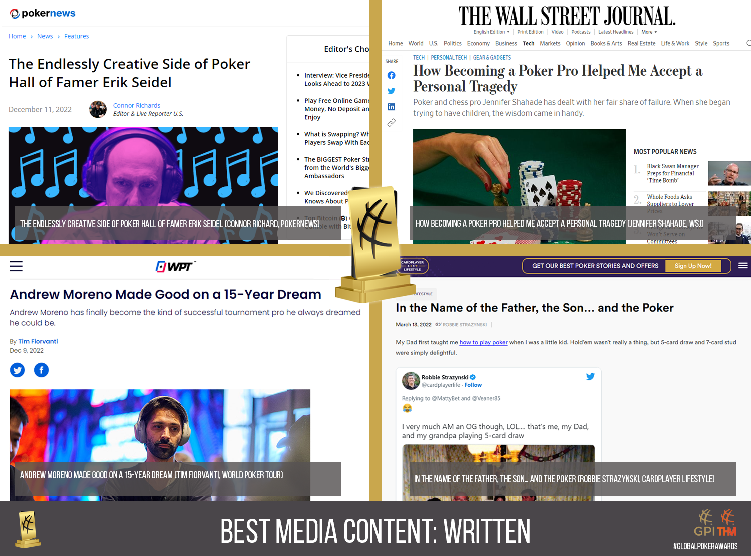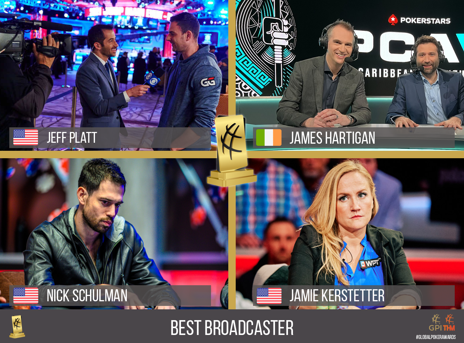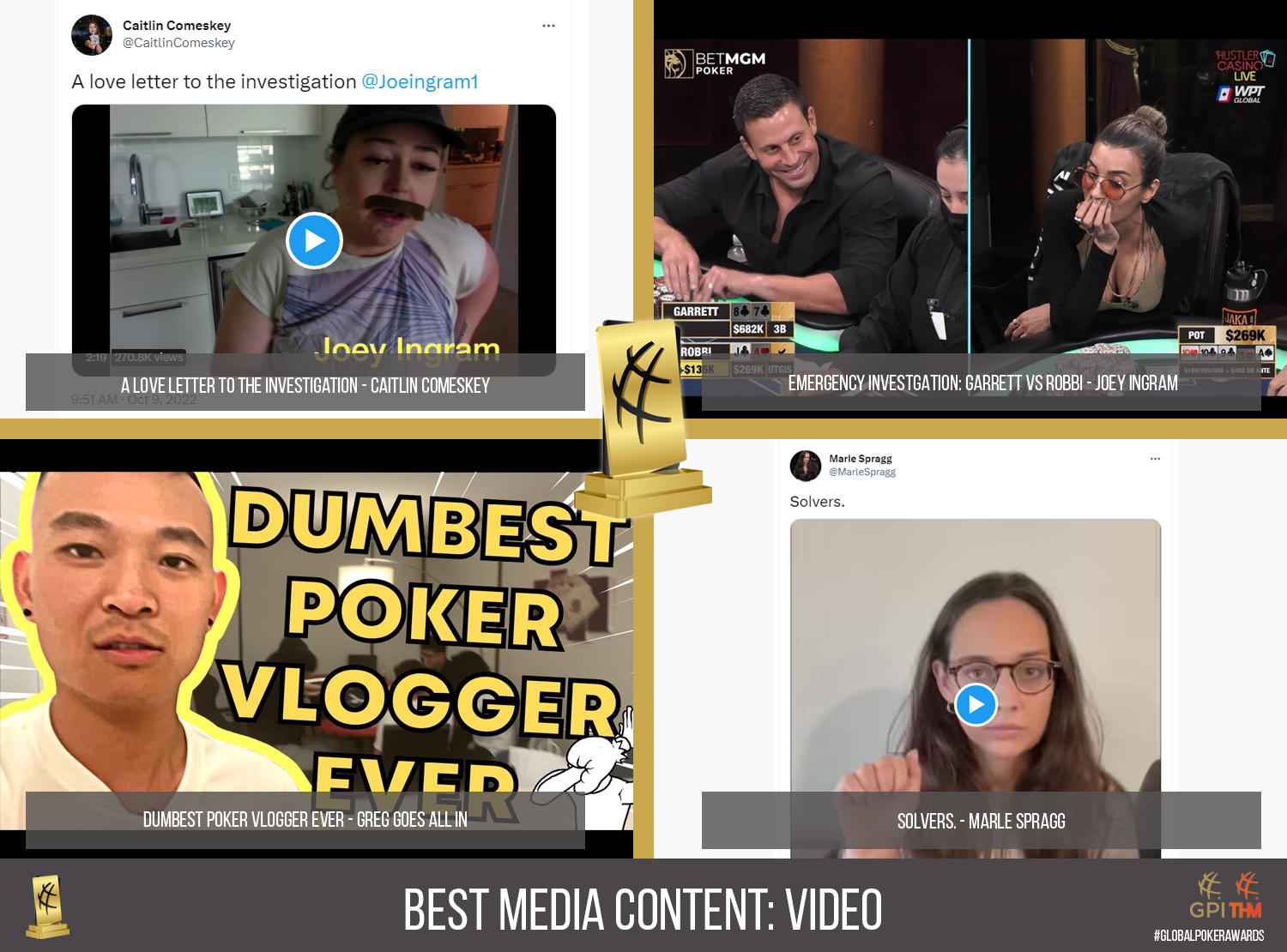 Trije so nominirani v dveh kategorijah, saj bo Jamie Kerstetter branila svoj naslov najboljše Twitter osebnosti, prav tako pa si je prislužila nominacijo v kategoriji najboljši voditelji. WSOP prvak Espen Jorstad je nominiran za največji preboj leta ter za njegovo igro na finalni mizi Main Eventa. Dvojna nominiranka pa tudi Marle Spragg, in sicer za video medijsko vsebino in Twitter osebnost.