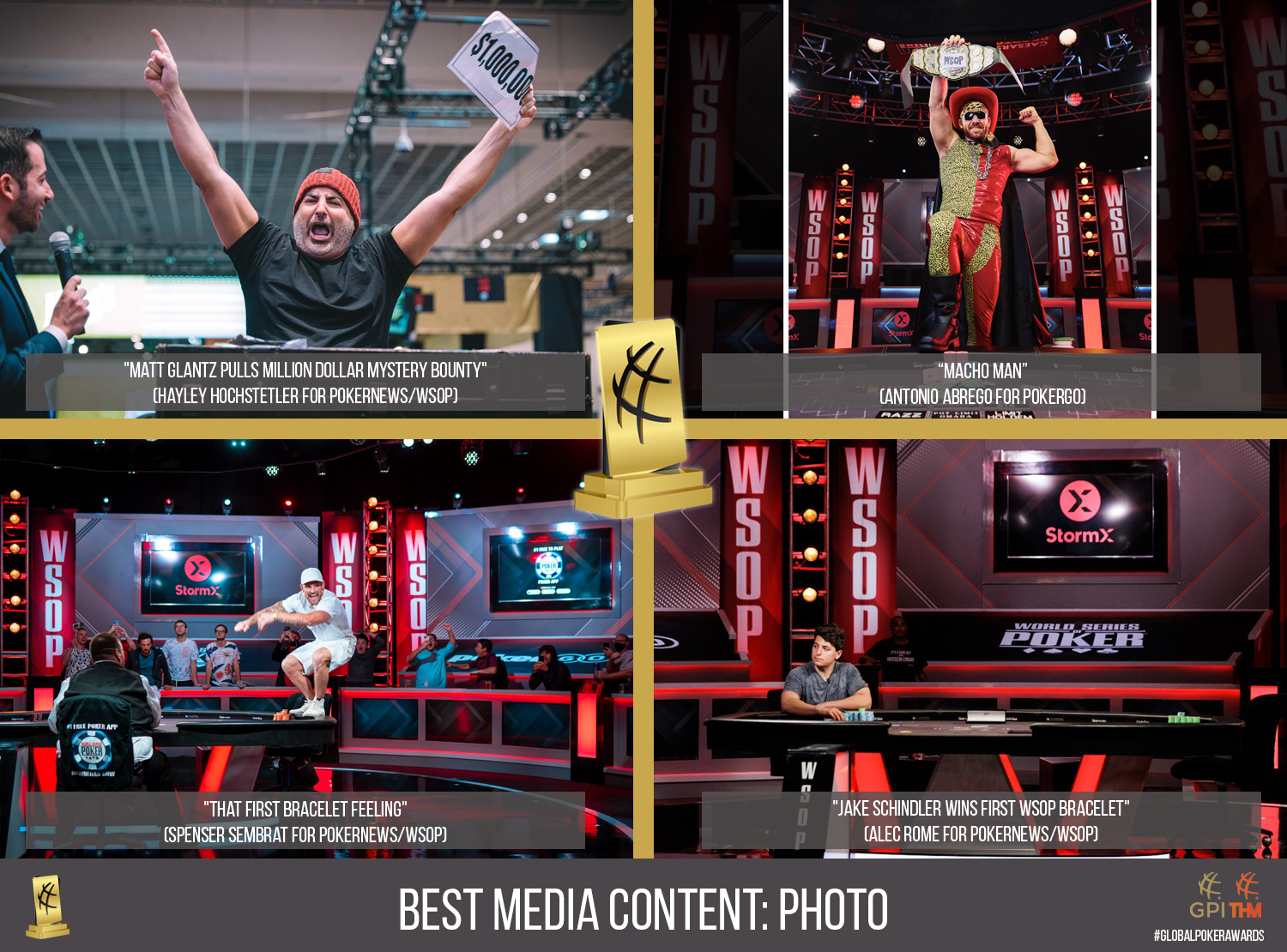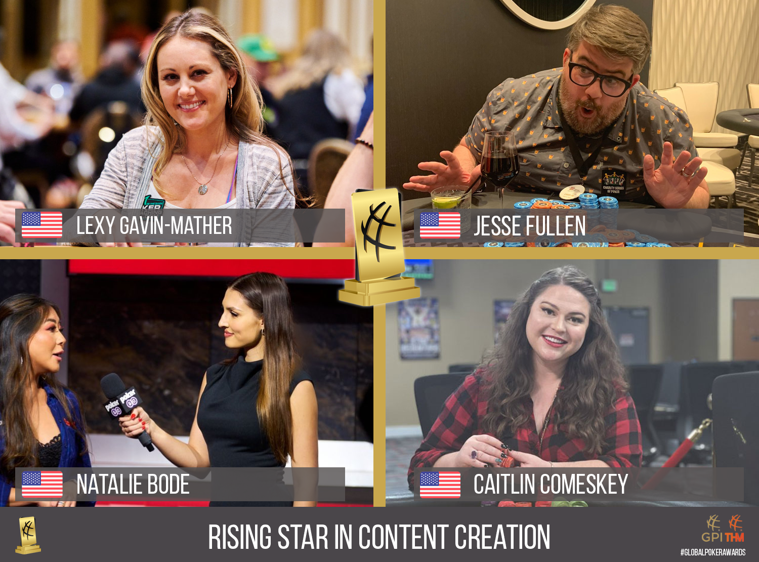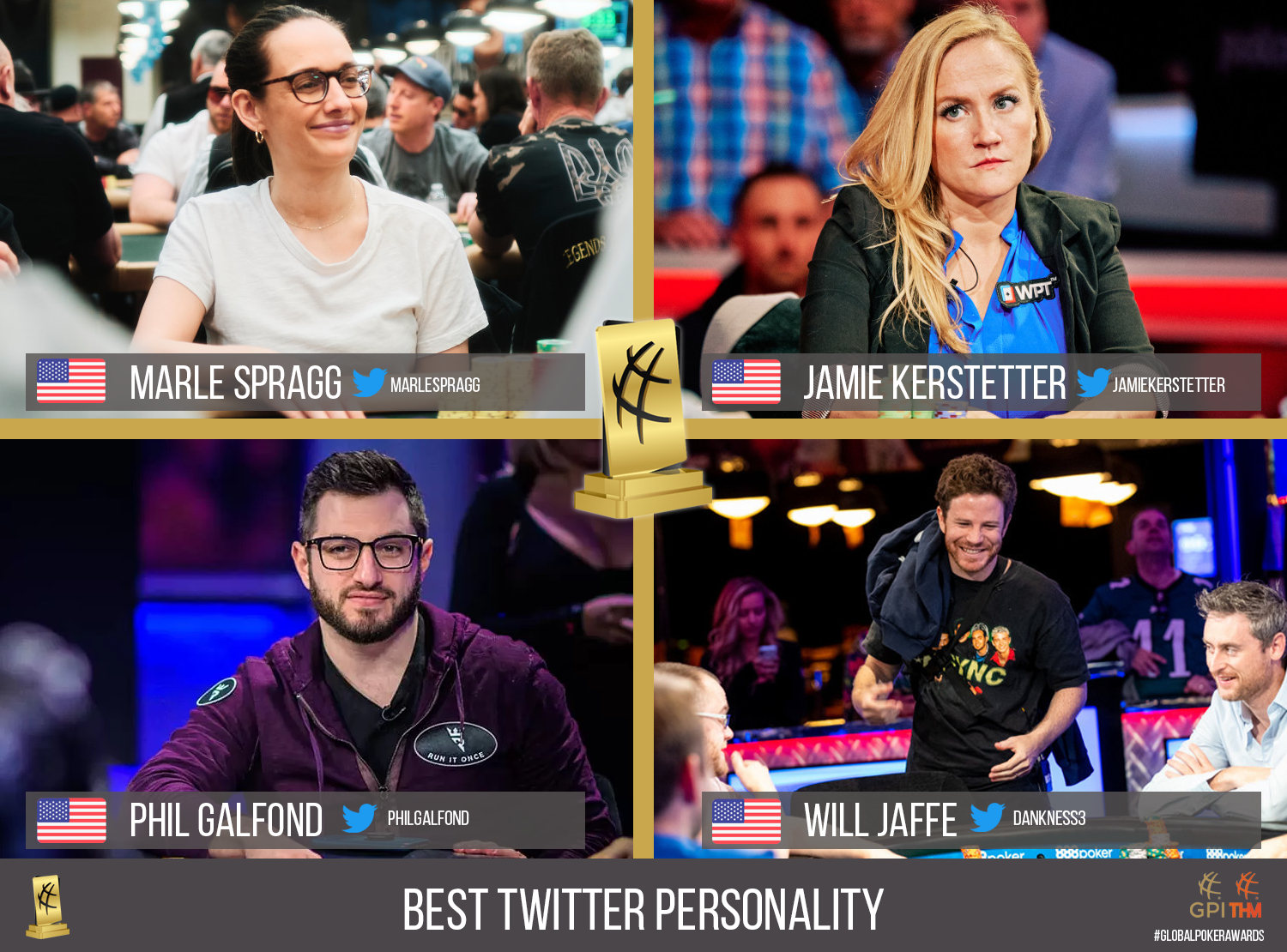 Trije so nominirani v dveh kategorijah, saj bo Jamie Kerstetter branila svoj naslov najboljše Twitter osebnosti, prav tako pa si je prislužila nominacijo v kategoriji najboljši voditelji. WSOP prvak Espen Jorstad je nominiran za največji preboj leta ter za njegovo igro na finalni mizi Main Eventa. Dvojna nominiranka pa tudi Marle Spragg, in sicer za video medijsko vsebino in Twitter osebnost.
