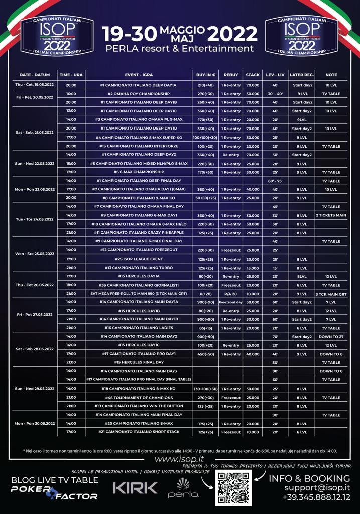 Od 19. do 30. 5. 2022 Perla gosti italijansko prvenstvo v pokru ISOP. Na sporedu je 21 dogodkov, na katerih bodo 21 zmagovalcem podelili zapestnice za naslov italijanskega prvaka.
