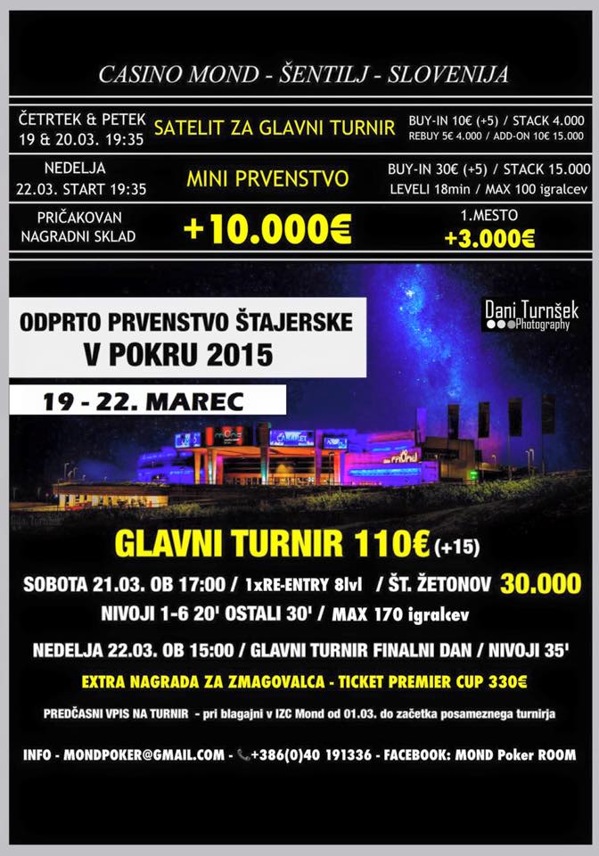 Casino *Mond*. V igralniško zabaviščnem centru Mond se bo od 21.-22. marca odvijal boj za prvaka Štajerske v pokru in pa seveda bogato nagrado (ticket za Premier Cup 330€), ki jo bo prejeli najboljši na turnirju.