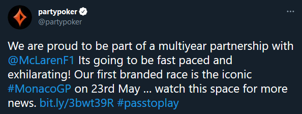 Novo partnerstvo se bo uradno začelo 23. maja na Veliki nagradi Monaka, kjer se bo blagovna znamka partypoker pojavila na varnostnih sistemih Halo na dirkalnikih McLaren MCL35M, pa tudi na čeladi voznika McLaren F1 Daniela Ricciarda.