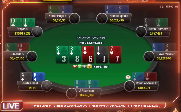 Za prvo izločitev na finalki je trajalo več kot dve uri. Justus Held (9. – 22.481 €) je nato postal prva žrtev, ko je s K4 klical z manj kot enin big blindom in ni mogel premagati JT, ki jih je držal Obreškov.