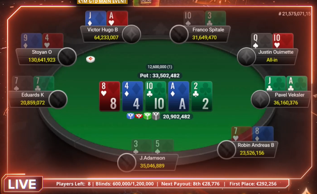Justin Ouimette je finalno mizo začel na drugem mestu z več kot 100 big blindi in bil eden največjih favoritov za zmago. Večino tega je izgubil v prvih dveh urah igre, preden je izpadel šele na osmem mestu za 28.776 €. Večino svojega short stacka je spravil v igro preflop s QT, vendar na koncu ni bilo dovolj.