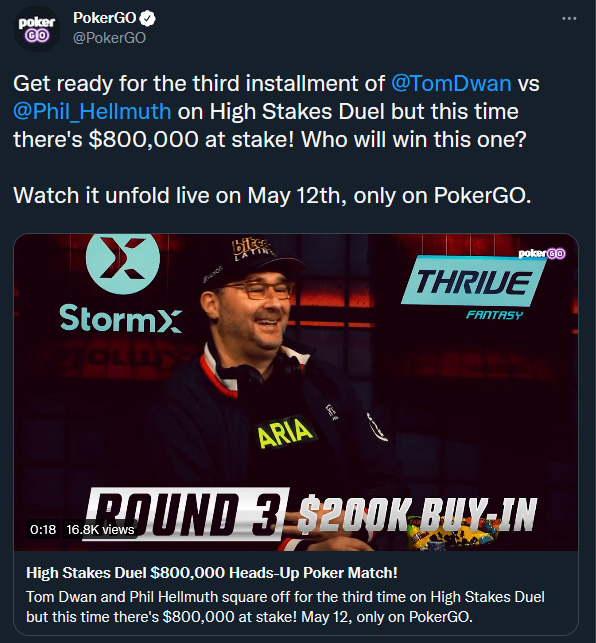 V petek, 13. maja 2022, se bosta Phil Hellmuth in Tom Dwan vrnila v PokerGO Studio v Las Vegasu, da odigrata dvoboj za 800.000 $ v 4. rundi High Stakes Duel III. To bo prvič, da se bo High Stakes Duel sploh igral za tako vsoto.