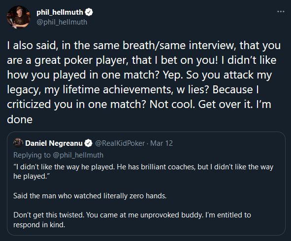 Že nekaj časa trajajoč prepir med dolgoletnima prijateljema Philom Hellmuthom in Danielom Negreanujem se je ta teden na Twitterju še stopnjeval.