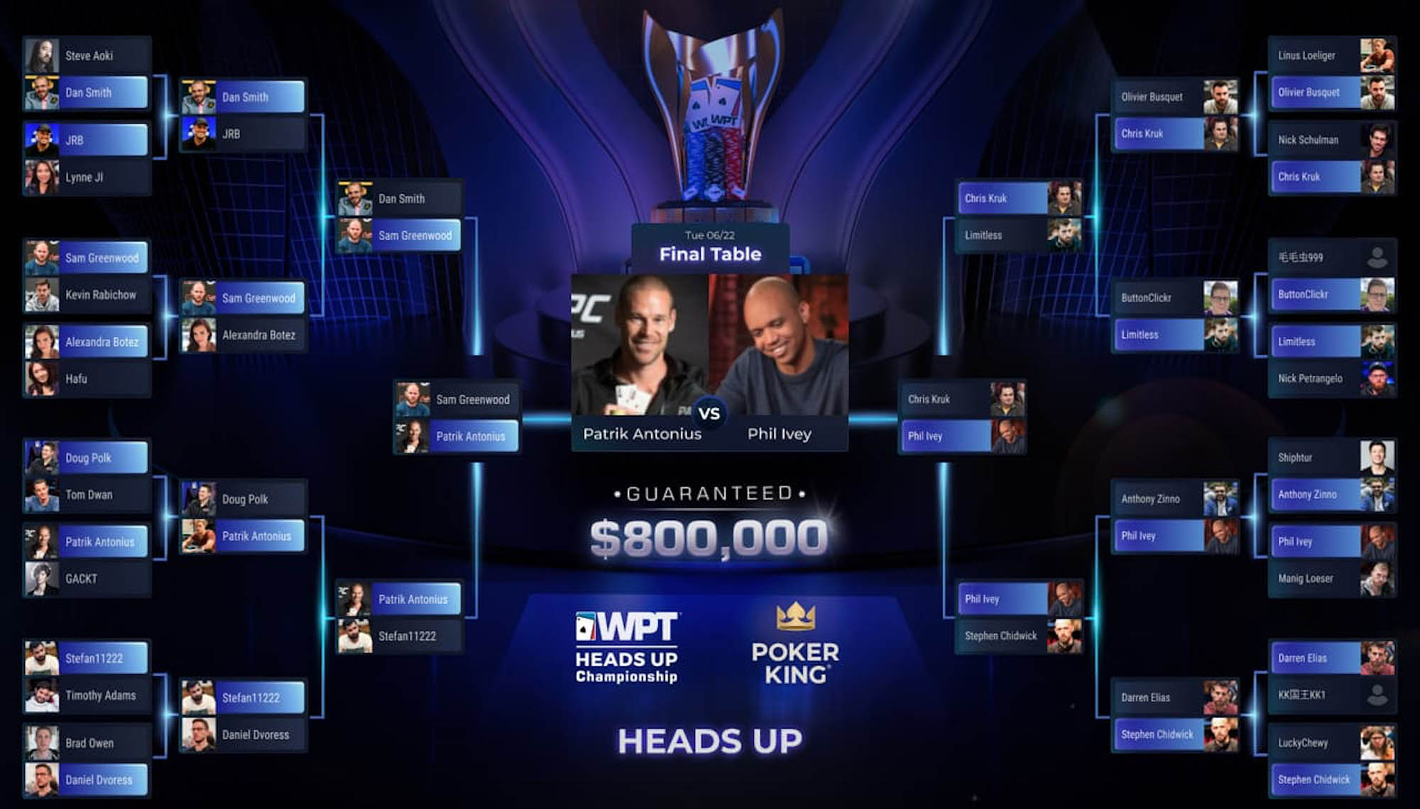 Na prvem World Poker Tour Heads-Up Championship prvenstvu z vstopnino 25.000 $ je nastopilo 32 igralcev, od vrhunskih profesionalcev pokra do spletnih vplivnežev in ustvarjalcev vsebin. Na koncu se je zadnji obračun za naslov odvil med dvema živima legendama igre: Phil Ivey in Patrik Antonius sta se med seboj pomerila že na marsikaterih igrah z najvišjimi vložki na svetu, tako na spletu, kot na največjih televizijskih denarnih igrah. Oba sta tudi osvojila milijone na turnirjih, skupaj med njima je kar 42,5 milijona dolarjev denarnih nagrad.