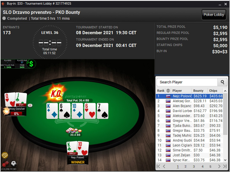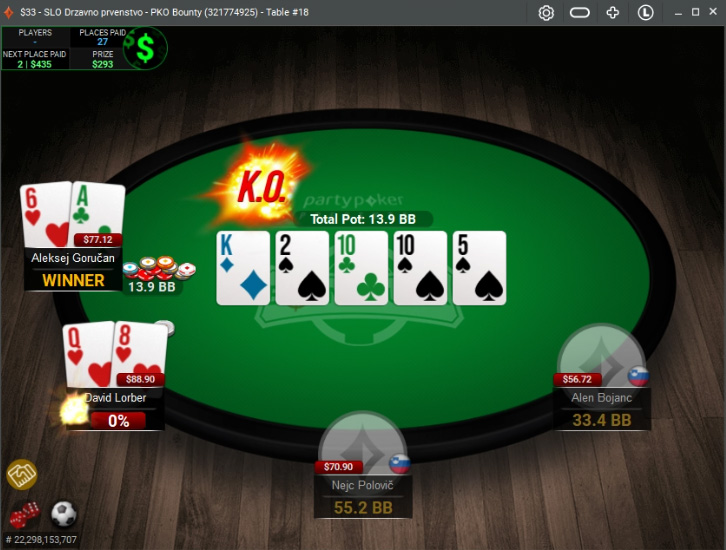 Eden izmed vrhuncev državnih prvenstev je vedno tudi PKO turnir, ki vsako leto postreže z dobro udeležbo in tudi tokrat je bilo tako, saj se je za prestižni naslov spopadlo 173 igralcev. Ker za izločitev nasprotnikov iz turnirja igralec dobi denarno nagrado, smo bili priča nekaj zelo pestrim handom.