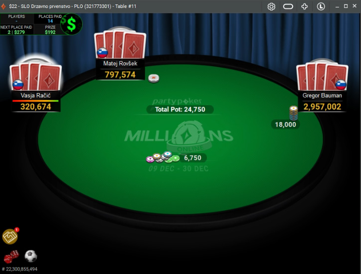 Hitro je odpadel Vasja Račić, Matej Rovšek pa se je kljub velikemu zaostanku dobro upiral in dosegel hitri double up in nato je igra postala takoj bolj zanimiva. A več kot to žal ni šlo in Gregor je eventuelno poklical na turnu z najboljših handom, ki je zdržal tudi zadnji river.