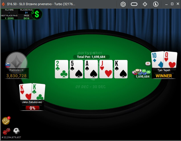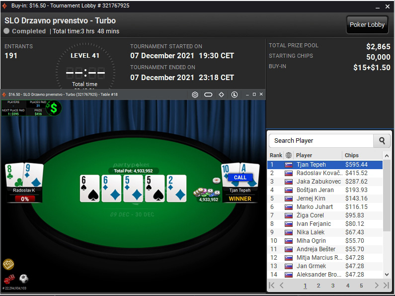 V zadnjem handu je Kovačević hotel izvesti drzen bluff na riverju, a je na njegovo žalost Tepeh zadel flush, ter ga poklical in se veselil naslova prvaka v Turbo turnirju in 595,44 $ nagrade.