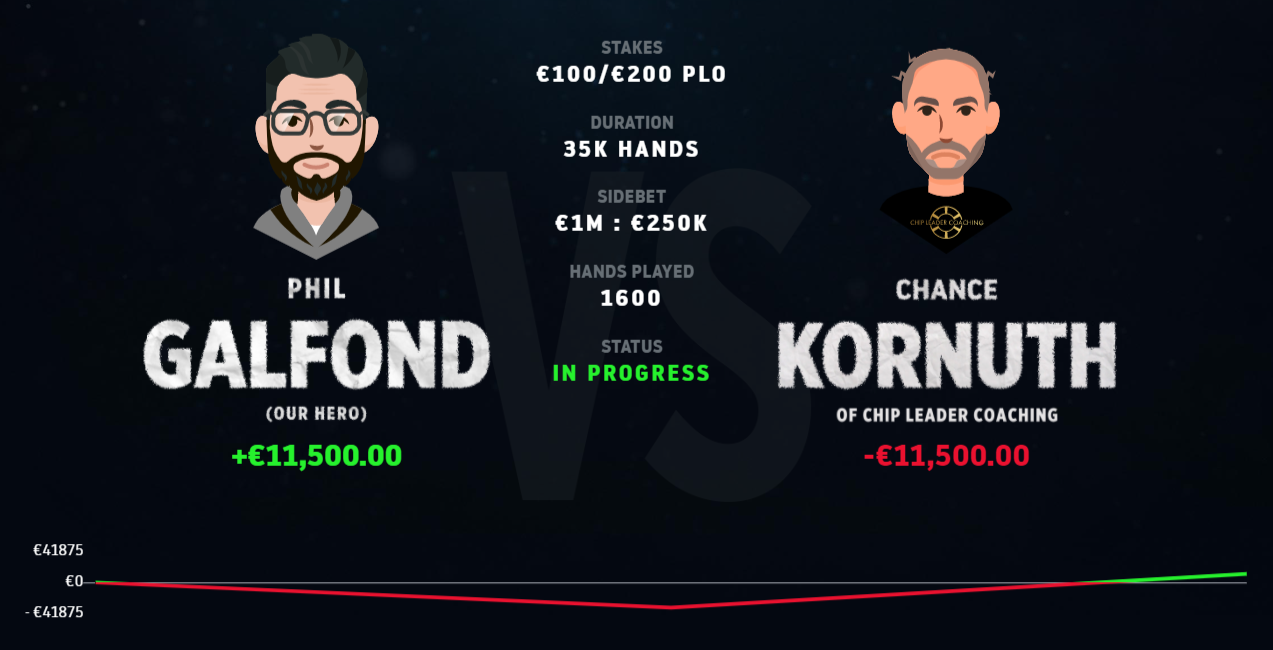 Prve hande sta odigrala pred dnevi, skupaj pa bosta v izzivu odigrala 35 tisoč handov igre Pot Limit Omaha s stavami 100€/200€, poleg tega pa imata tudi stransko stavo. Če bo po končanem izzivu v prednosti Galfond, bo od nasprotnika prejel še dodatnih 250.000€, v nasprotnem primeru pa bo Kornuth prejel vrtoglavih 1.000.000€.