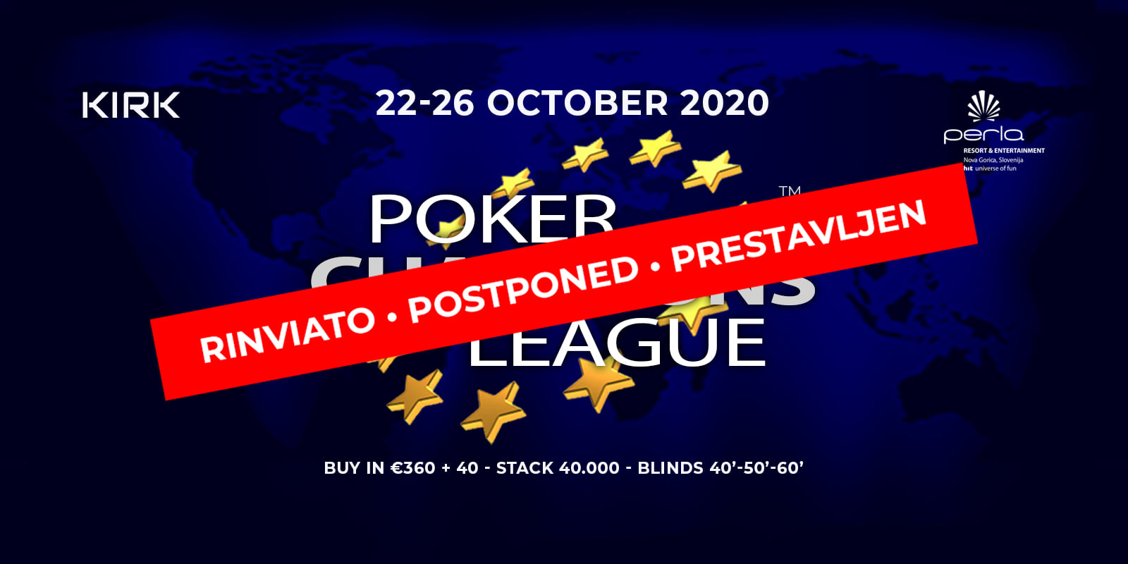Poker Champions League dogodek v novogoriški Perli, ki bi se moral odviti ta teden od 22. do 26. oktobra, je zaradi razglašene 30-dnevne epidemije prestavljen na (zaenkrat) neznani kasnejši datum.