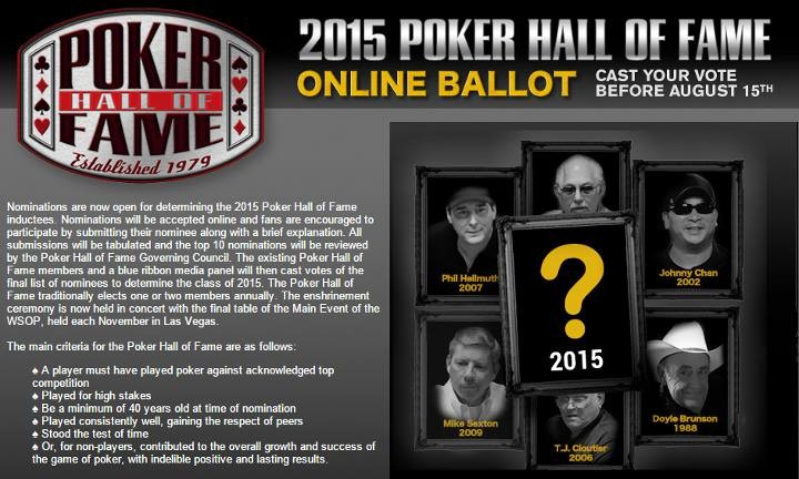 Nominacije za Poker Hall of Fame so odprte in sedaj lahko tudi vi nominirate svojega najljubšega poker igralca. Samo obiščite stran Poker Hall of Fame section of the WSOP.com website in oddajte svoj glas. Glasovanje se konča 15. avgusta 2015.