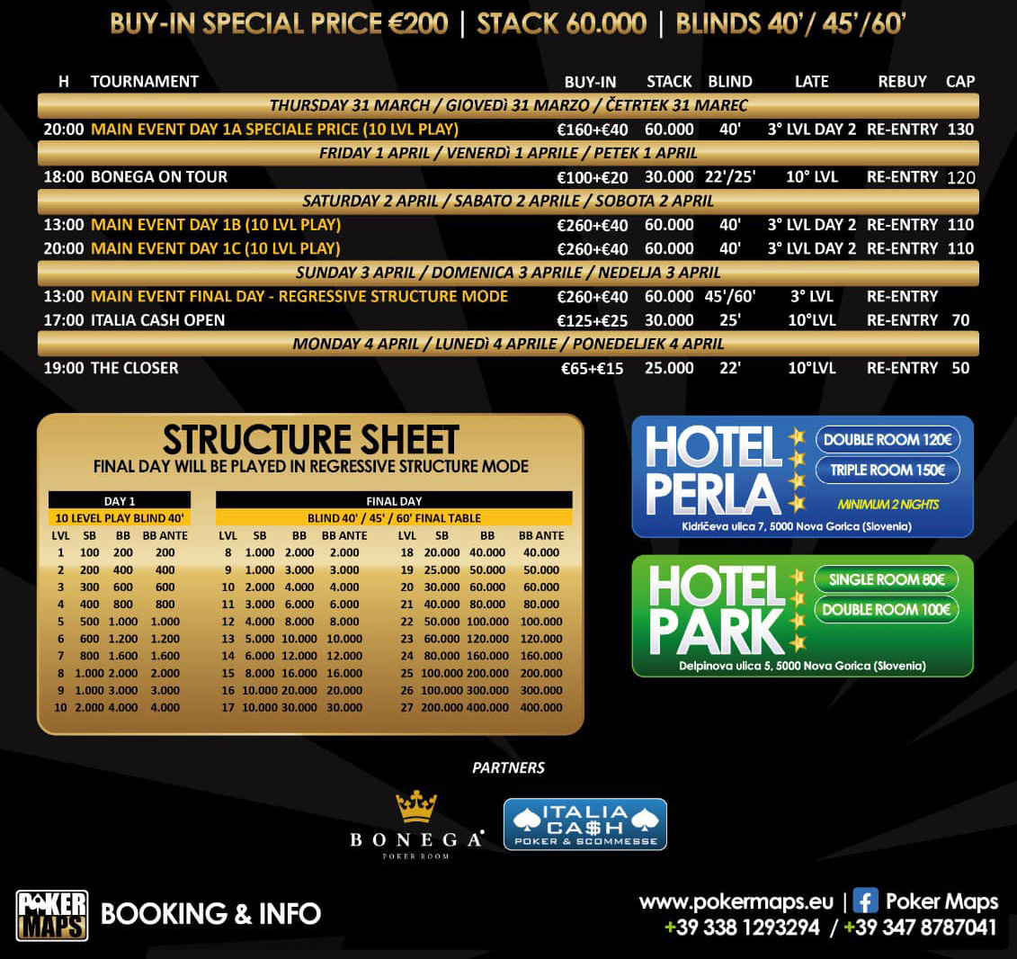 Turnirski program bosta dopolnila dogodek Bonega On Tour s pristopnino 120 € in stackom v višini 30.000 žetonov, ki se bo igral v petek, 1. 4., ob 18. uri, in Italia Cash Open s pristopnino v višini 150 €, na sporedu v nedeljo, 3. 4., ob 17. uri.