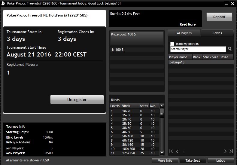 Za igranje Freerolla poleg gesla potrebujete vsaj en depozit ($10) na svoj real money račun, ki pa ga lahko tudi nemudoma cashoutate. Vsem, ki boste zaigrali na PokerPro Bwin Freerollu, želimo obilo zabave ob igranju.