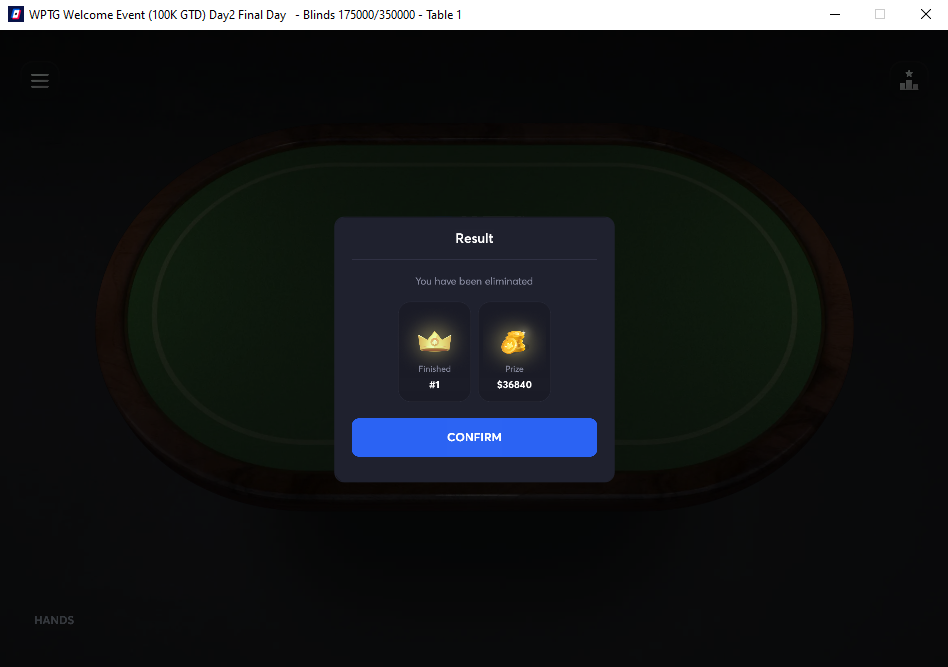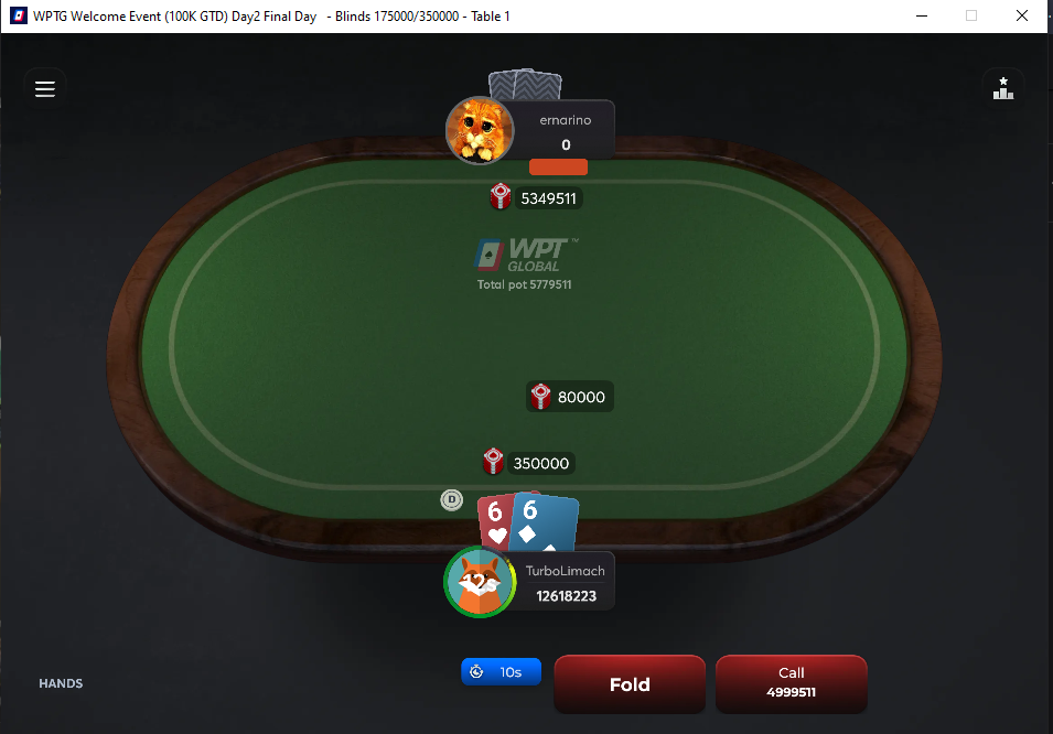 “Nato je igra potekala hitro, v petnajstih minutah sem prišel iz 5 left na HU in po zaostanku 2:1 v žetonih zmagal na koncu s parom 66, ko je nasprotnik porinil vse z A7o.”