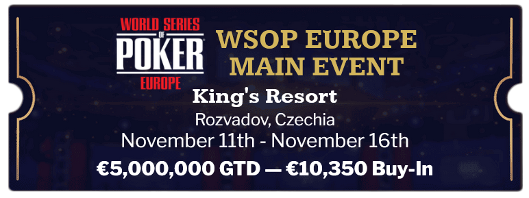 WSOP Europe bo ponovno potekal v King’s Resortu v Rozvadovu na Češkem, in sicer od 26. oktobra do 16. novembra s 15-imi dogodki, kjer se bodo podelile prestižne zapestnice in skupaj kar 12 milijonov € denarnih nagrad.