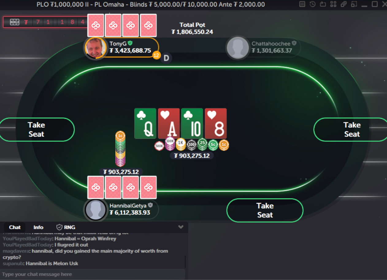 Ponovno je bil Tony G v igri proti igralcu, znanemu kot ‘HannibalGetya’. Oba igralca sta imela ₮3,798,320 efektivnih na mizah ₮5,000/₮10,000 PLO, ko se je to zgodilo: