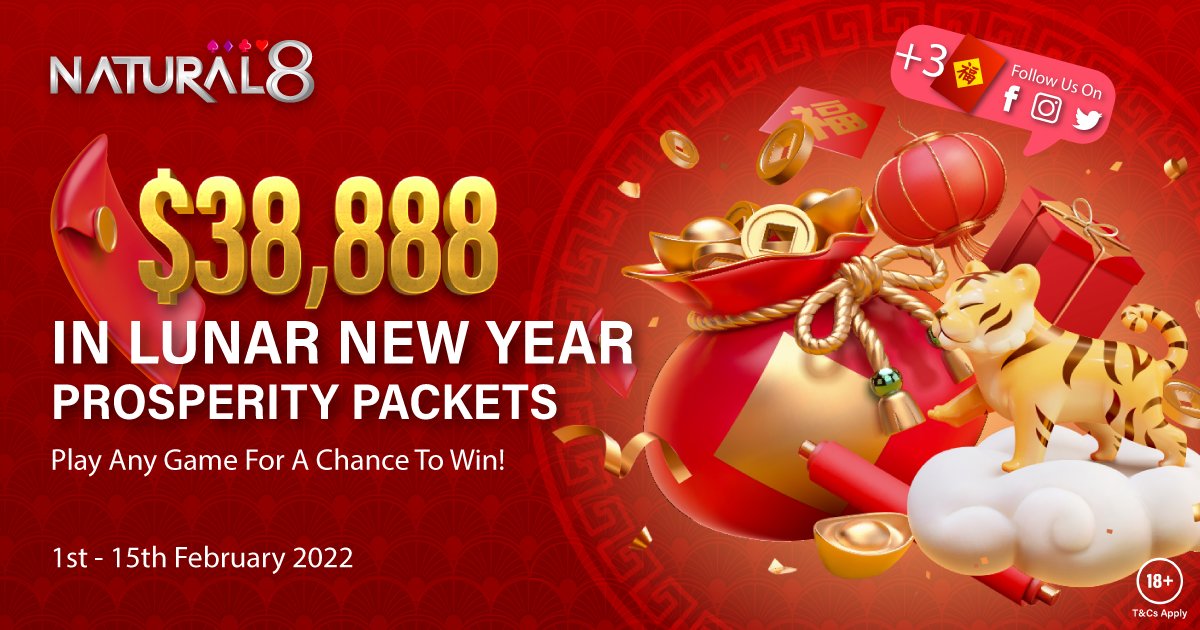 Sreáno lunarno (kitajsko) novo leto! Praznujte ga na Natural8, ki podarjajo 38.888 $ v paketih Prosperity. Igralci imajo moéƒnost, da vsak dan zasluéƒijo 1 paket tako, da igrajo katero koli igro na Natural8 od 1. februarja do 15. februarja 2022. Ta promocija je kot nalaéÀá za igralce, ki imajo radi vznemirjenje ob odpiranju rdeáih paketov, kot tudi za tiste, ki iéÀáejo dodatne nagrade.