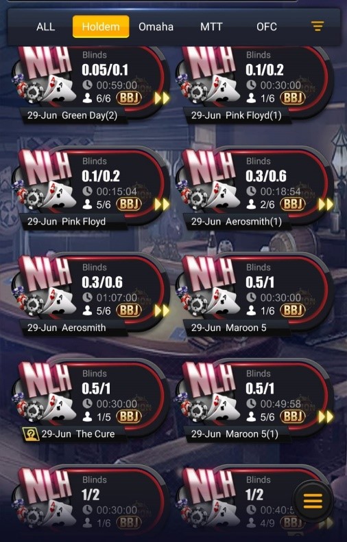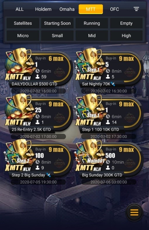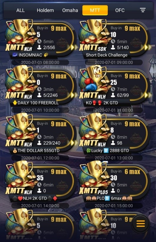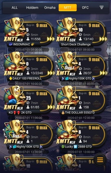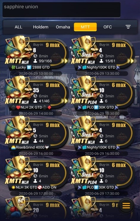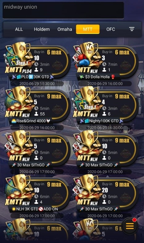 Na voljo so vam tudi zanimivi MTT turnirji, ki potekajo skozi celoten dan in vam ponujajo dva formata 6-max in full ring. Ponujajo vam več vrst pokra, kot so NLH, PLO, PLO6 in 6+, vstopnine pa potekajo od 4 žetonov pa vse do 100 žetonov.
