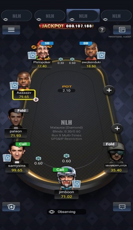 Diamond unija je ena izmed največjih unij na PokerBros aplikaciji, kjer igre potekajo skozi celoten dan. Na voljo so vam različne vrste iger, kot so NLH, PLO, PLO5, PLO6, 6+, OFC IN MTT. Našli boste tri različne formate iger 5-max, 6-max in full ring. Igre se pričnejo pri 0,10/0,20 in gredo vse do 10/20. Cash game je precej soft, z veliko limpanja.