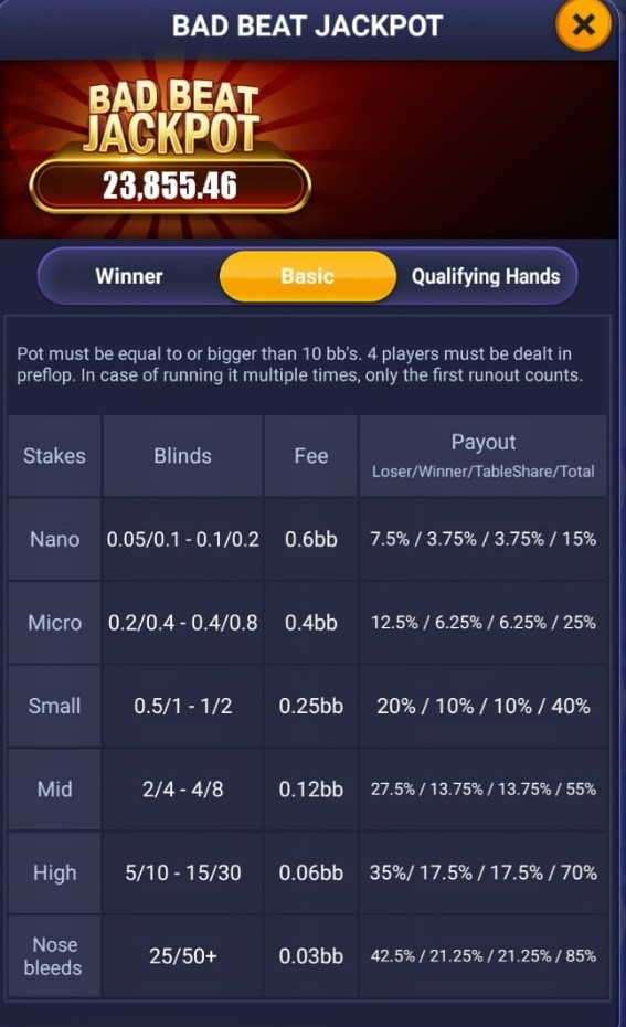 Tudi pri PokerBros aplikaciji imajo na voljo bad beat jackpot, izračun za izplačilo si lahko ogledate na dodani sliki.