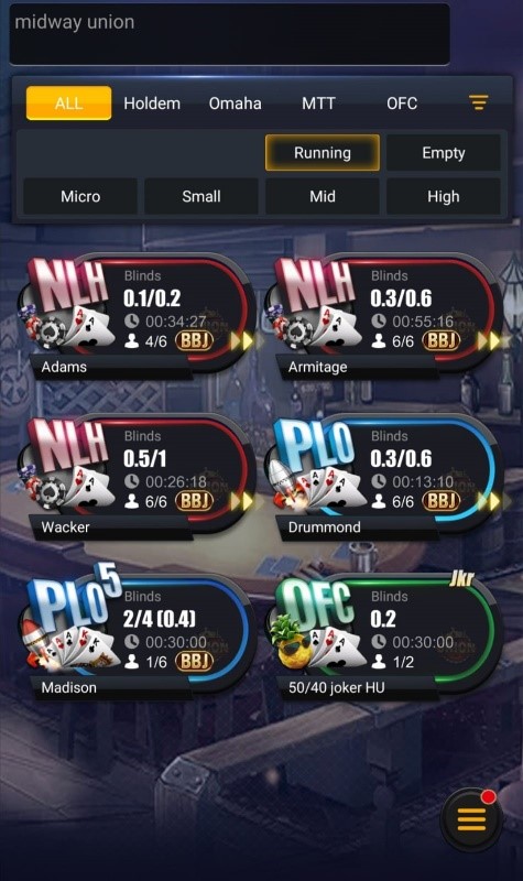 V Midway uniji poteka zelo dobra akcija, na izbiro imate različne igre NLH, PLO, PLO5, PLO6 OFC in MTT. Igralci boste navdušeni saj vam unija ponuja veliko akcije pri HU, 6-max in full ring formatih. Igre se pričnejo pri 0,10/0,20 in potekajo vse do 5/10. Največ akcije poteka v večernih urah.