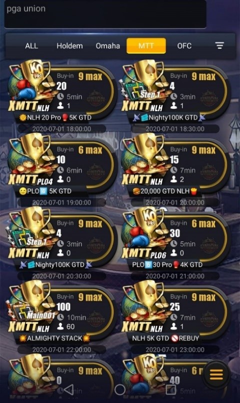 V PGA uniji so vam na voljo tudi različni MTT turnirji, ki se gibljejo z vstopninami od 1 žetona in vse do 100 žetonov. Na voljo vam je štiri različne igre NLH, PLO, PLO5 in PLO6, v dveh različnih formatih 6-max in full ring. Že iz 4 žetonov lahko naredite vstopnico za turnir, na katerem je garantiran sklad 100.000 žetonov.