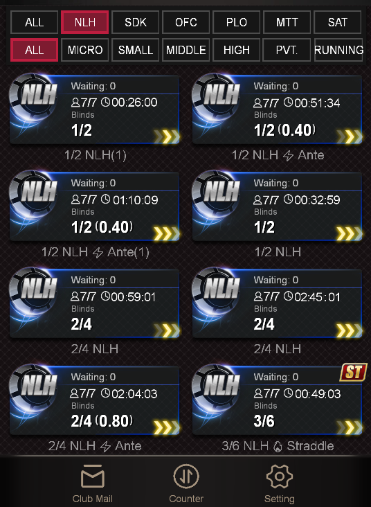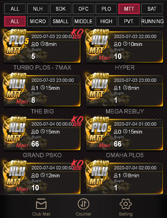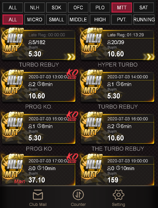 Poleg odlične cash game ponudbe pa imate na voljo tudi MTT turnirje, ki se odvijajo skozi celoten dan. Na voljo so vam turnirji z vstopninami od 5,30 žetonov in vse do 349,80 žetonov. Našli boste različne vrste iger, kot so NLH, PLO in PLO5, ki se odvijajo v treh različnih formatih 7-max, 8max in full ring. Našli boste tudi knockout turnirje.