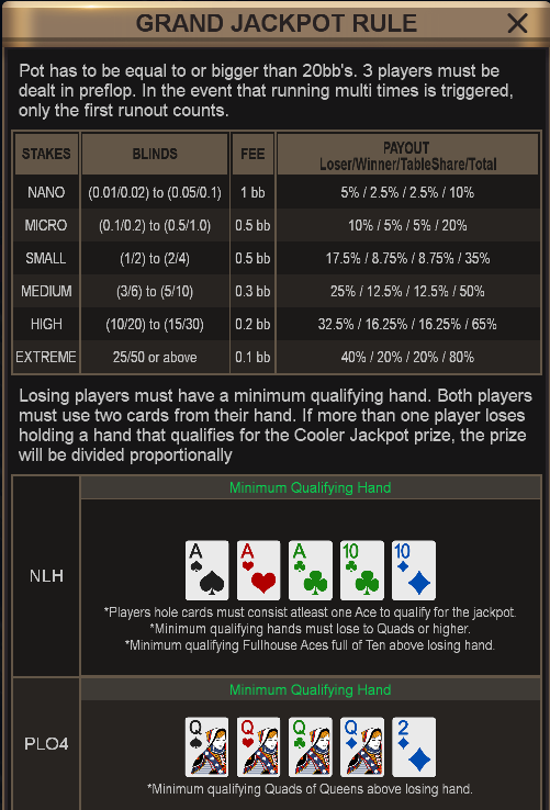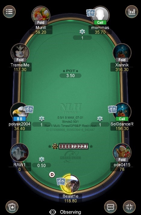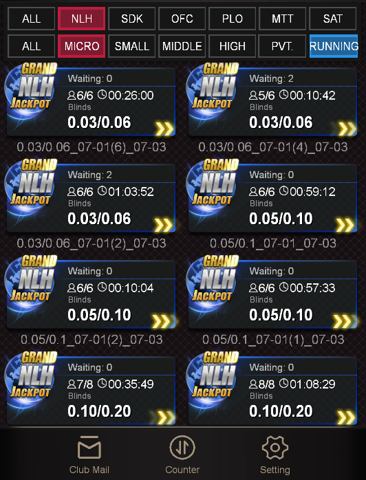 GRAND UNION PH je ena izmed največjih unij na UPoker aplikaciji in ponuja veliko akcije skozi celoten dan. V tej uniji najdete več različnih iger, kot so NLH, PLO, PLO5, PLO6, PLO Hi/Lo, 6+, OFC in MTT. Na voljo so vam igre, ki se pričnejo z stavami 0,03/0,06 žetonov in potekajo vse do visokih limitov 15/30 žetonov. Na voljo so vam štirje različni formati 6-max, 7-max, 8-max in full ring.