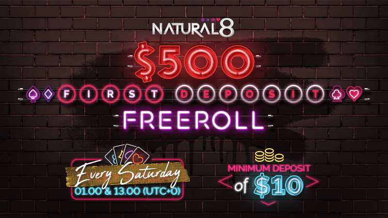 Vsi igralci, ki boste na Natural8 opravili prvo nakazilo v višini vsaj 10 $, boste poleg bonus dobrodošlice prejeli tudi vstopnico do tedenskega First Deposit Freerolla s 500 $ skladom.