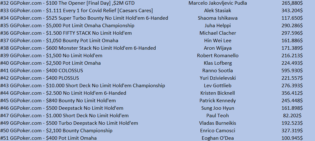 Imeli smo že tudi nekaj dobrih slovenskih rezultatov. Najbolje nas je zaenkrat zastopal Blaž Žerjav, ki se je že štirikrat uvrstil med dobitnike nagrad. Najbolj pa se je približal WSOP zapestnici na naslednjih dveh turnirjih, 12. mesto na eventu #45 – $840 Bounty No Limit Hold’em in 11. mesto na eventu #47 – $1,000 Short Deck No Limit Hold’em.