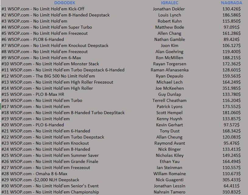 Dobitniki WSOP zapestnic na klientu WSOP.com: